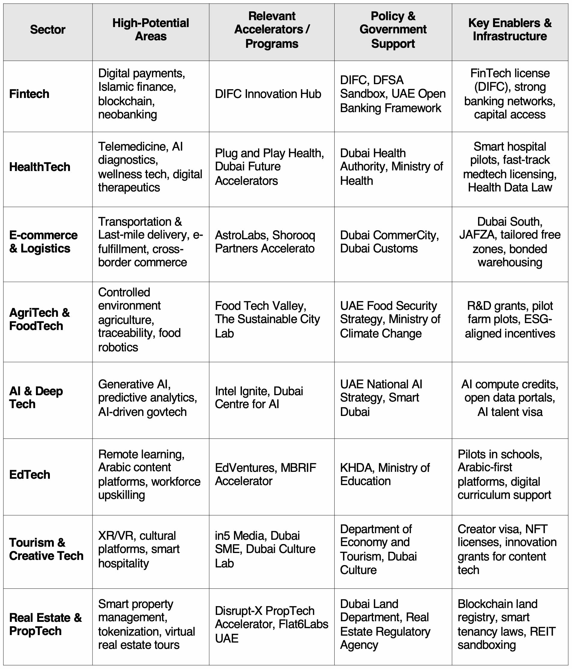 The emirate has firmly established itself as the UAE’s leading hub for innovation and venture capital, yielding 96% of all start-up funding in the country during the first quarter of 2025. These funding patterns reflect sectors where Dubai offers a unique mix of policy support, investor interest, and growth infrastructure. Below is a breakdown of these opportunity areas and the ecosystem enablers accelerating them.