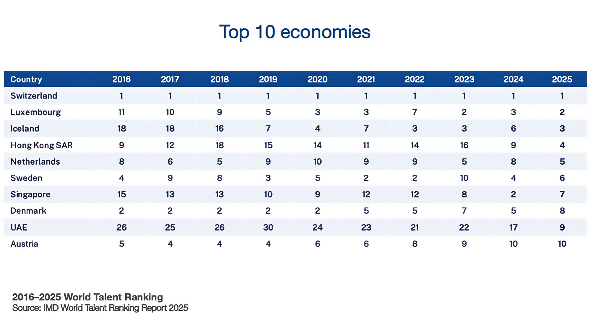 The United Arab Emirates came in 9th in the IMD World Talent Ranking 2025, marking its first entry into the top 10 most competitive economies for talent. This is the country’s best result since the index began and reflects steady progress in workforce readiness, international appeal, and infrastructure. This development is significant for foreign investors and entrepreneurs looking to expand in the UAE, especially in Dubai, one of the country’s main hubs for global businesses.